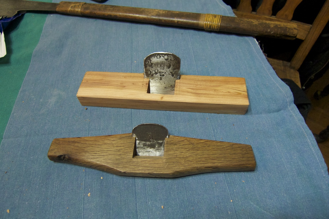 You remember it, a dusty plane on a shelf, mouth opening on that one a bit sloppy from the outset, a piece of hard pinkish unnamable wood set in to close things up but an epoxy mixture not wanting to cooperate. It was also this Sunday, something telling me to take that one in hand and see if the epoxy ever did do its thing and it looked like maybe it had. Some trimming down, some careful filing, and after conditioning the sole of that plane, as they say, it begins to produce some very decent shavings and is surely a pleasure to put to wood, this time some fine douglas fir giving it a glass like finish. Humm, these Japanese planes, maybe there is something to it after all.